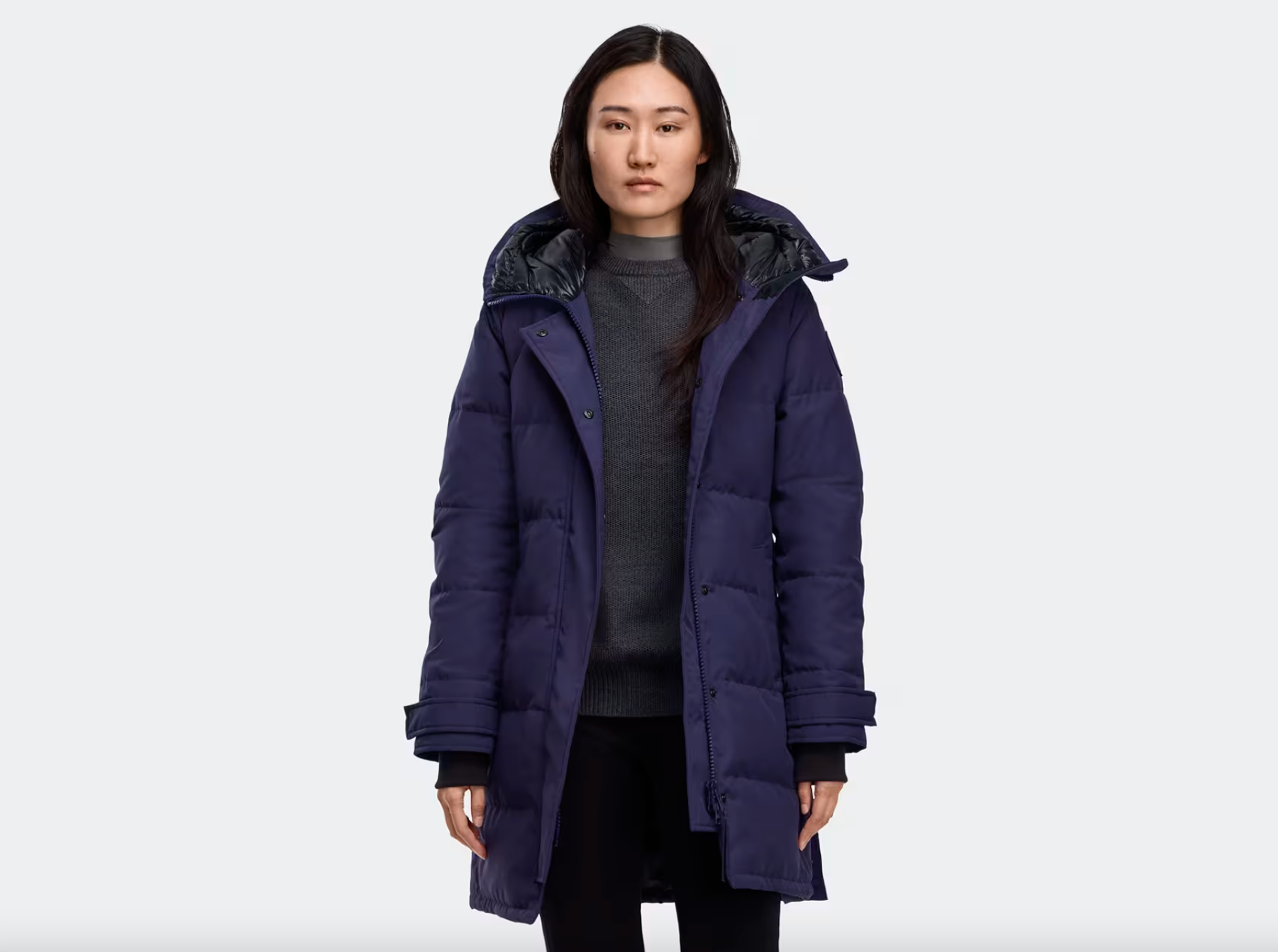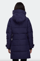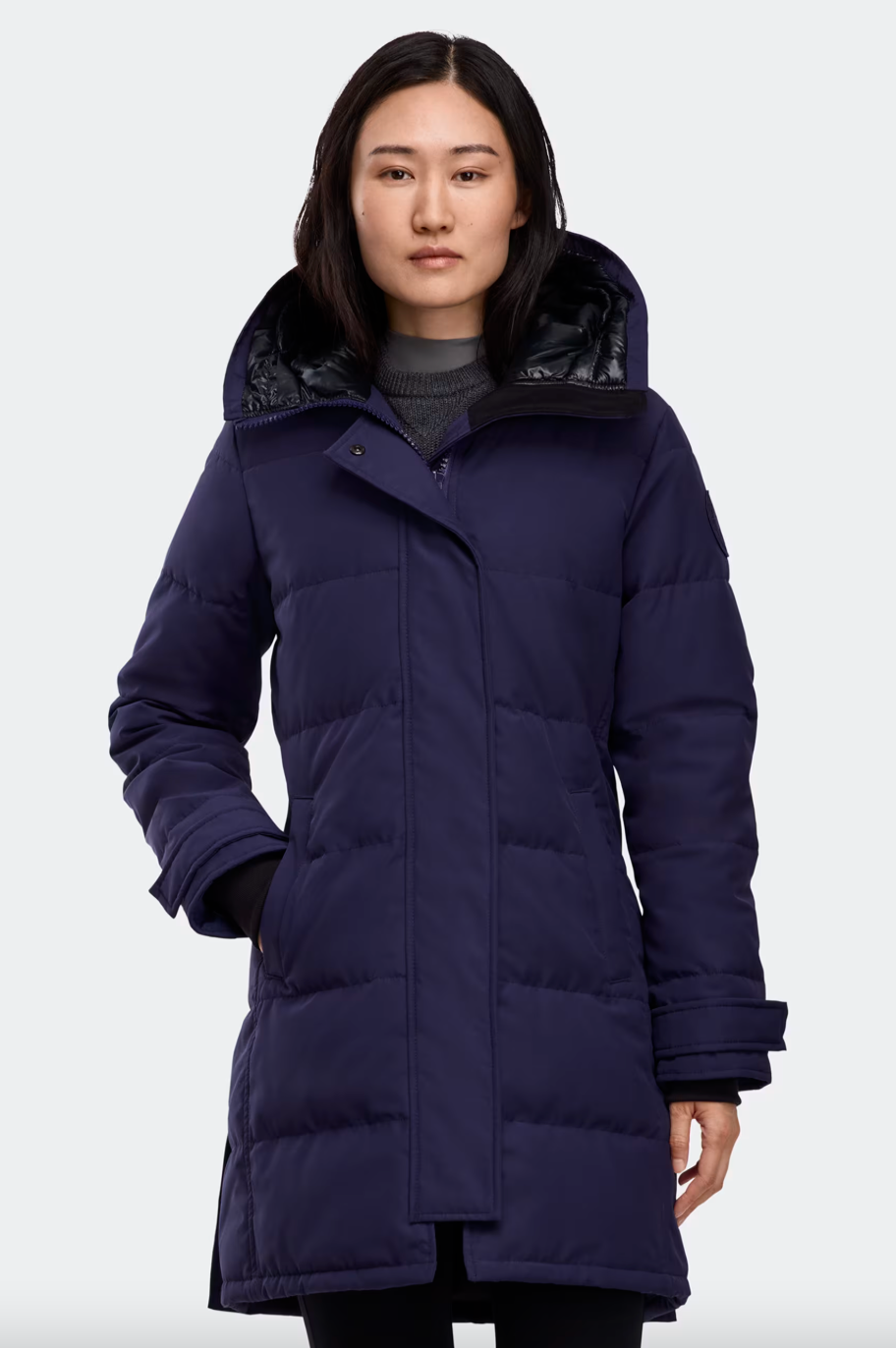 The Canada Goose Women's Shelburne Parka, crafted in Recycled Organic Arctic Tech®, offers superior protection in temperatures ranging from -10°C to -20°C. Designed with an adjustable down-filled snorkel hood and back vent with snaps, it balances warmth with mobility. Features include a tricot-lined chin guard, interior backpack straps for hands-free carrying, adjustable snap cuffs, and multiple secure pockets with fleece lining or mesh for convenience. Made in Canada, this tonal parka blends refined style with practical cold-weather performance.
