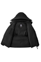 - Adjustable hood features a high collar with hidden snap closures for added coverage and protection from harsh weather