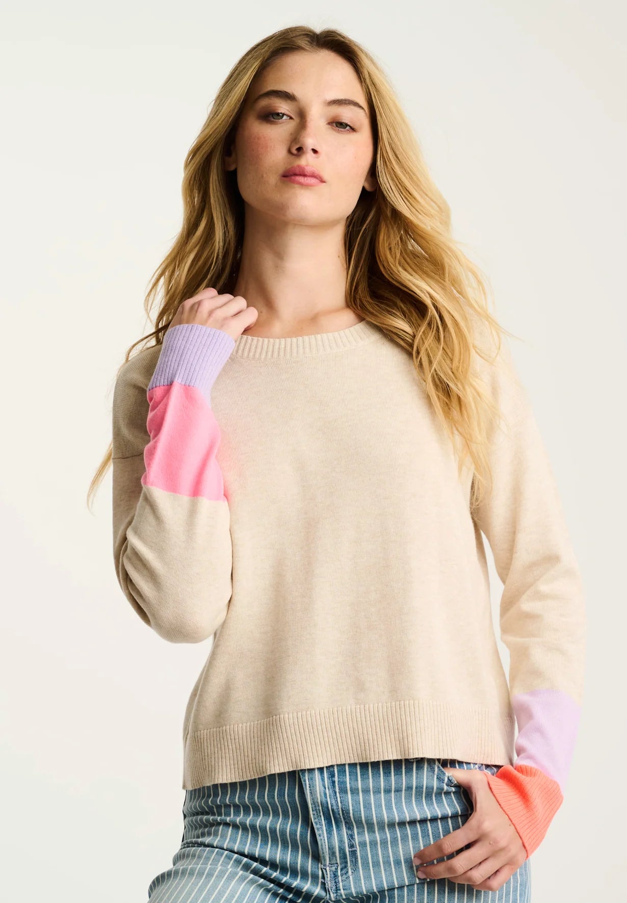 Elevate your everyday wardrobe with this refined women's sweater, crafted from 100% cotton for breathable comfort and lasting durability. The crew neckline and long sleeves feature striking colorblock detailing that adds contemporary visual interest without compromising sophistication. Finished with ribbed trim for a polished silhouette, this piece delivers effortless style. True to size for a perfect fit.