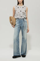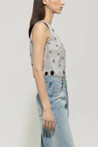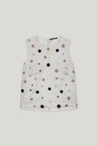 Sleeveless, boxy cut blouse made of organza with all-over sewn-on decorative elements The unusually designed blouse has an opaque lining and a button fastening at the neck.