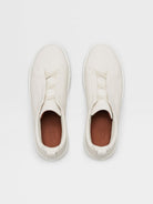 The off white deerskin Triple Stitch™ low-top sneakers are mounted on an extra-light, white rubber sole. The brand’s signature triple-crossed elastic detail ensures an easy slip-on fit, while evoking the traditional hand-stitching of tailored jackets to symbolize and honor Zegna’s legacy of fine craftsmanship. Foliage-colored leather lining completes the design.