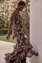 The Misa Women's The Eliana Dress features a sleeveless halter neckline crafted from lightweight Chained Blossom printed chiffon. Its high-low midi silhouette flatters while the tiered ruffle hem adds graceful movement. With a back-button keyhole closure and an optional self-tie belt to accentuate the waist, this slipover dress offers effortless sophistication. Perfect for pairing with heels and a clutch or styled with knee-high boots and a blazer for a chic seasonal ensemble.