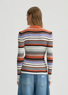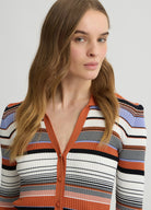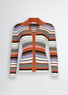 Elevate your wardrobe with this exquisite viscose-blend knit cardigan. Featuring refined ribbed knit construction with luxurious Lurex® inserts that add a subtle shimmer. The sophisticated multicoloured striped motif creates visual interest while the flattering V-neck silhouette offers versatile styling options. A perfect balance of comfort and elegance for the discerning woman.