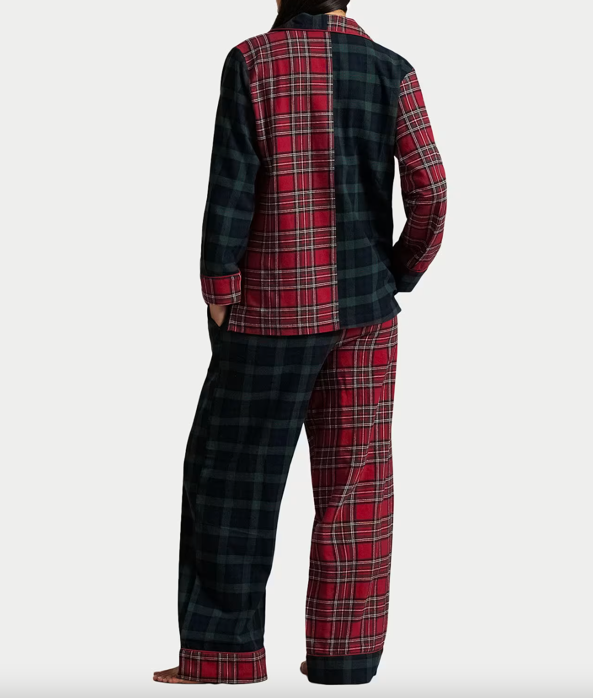 Indulge in timeless comfort with this Ralph Lauren pajama set, crafted from soft 100% cotton that feels luxurious against the skin. The sophisticated design features contrasting red and green tartan plaids that elevate your sleepwear aesthetic. The button-down top includes a chest pocket adorned with the iconic Polo pony, while long sleeves offer adjustable warmth. Relaxed-fit pants with an elastic waistband and functional side pockets complete the set, making it equally suited for restful nights or leisurely mornings at home.