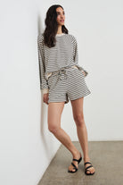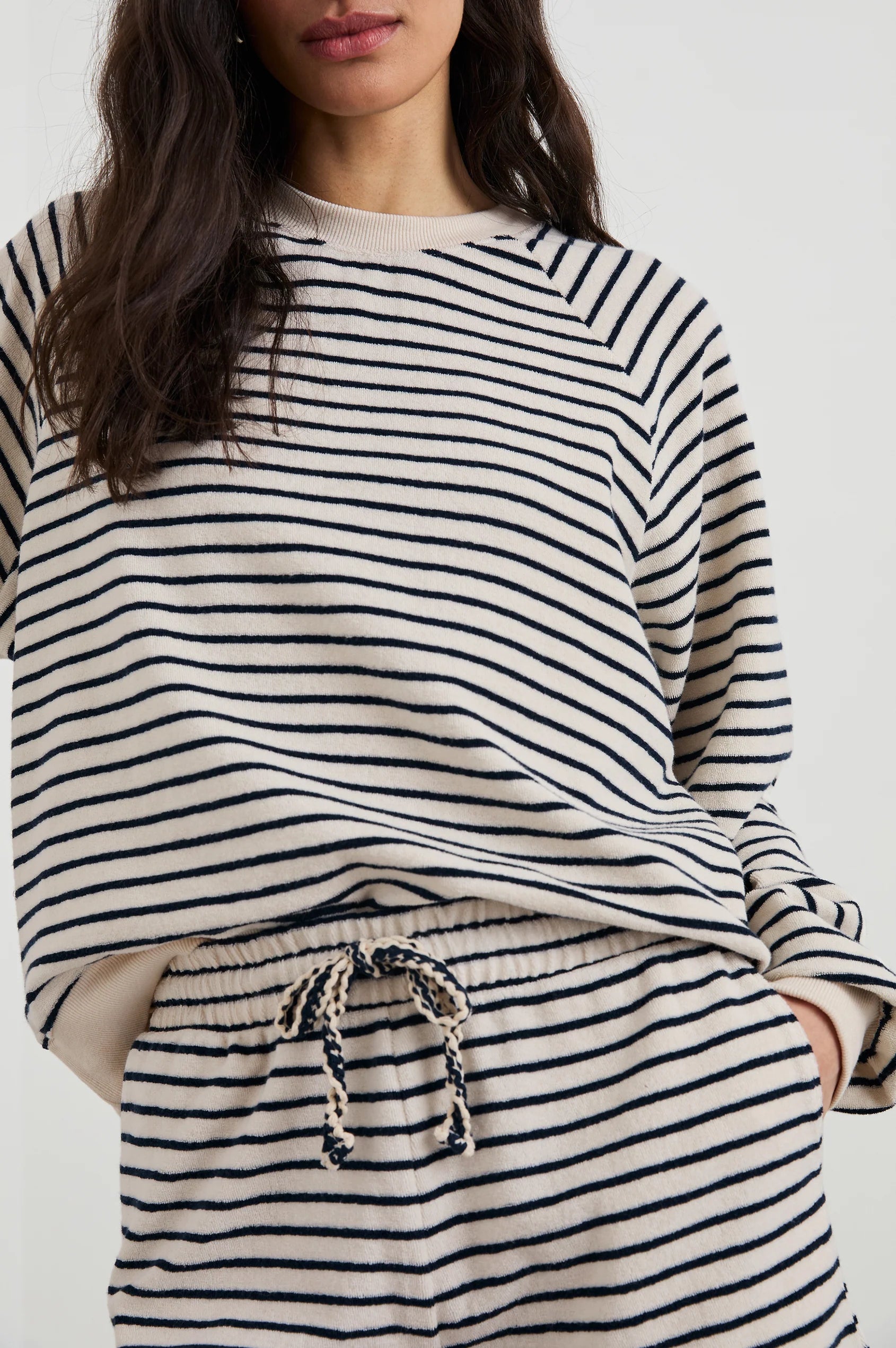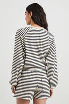 Show your stripes in the Theron, a super soft terry towel sweatshirt. Featuring contrasting ribbed cuffs and hem with a nautical-inspired print, this will be your new go-to for brunch and late-night bonfires.