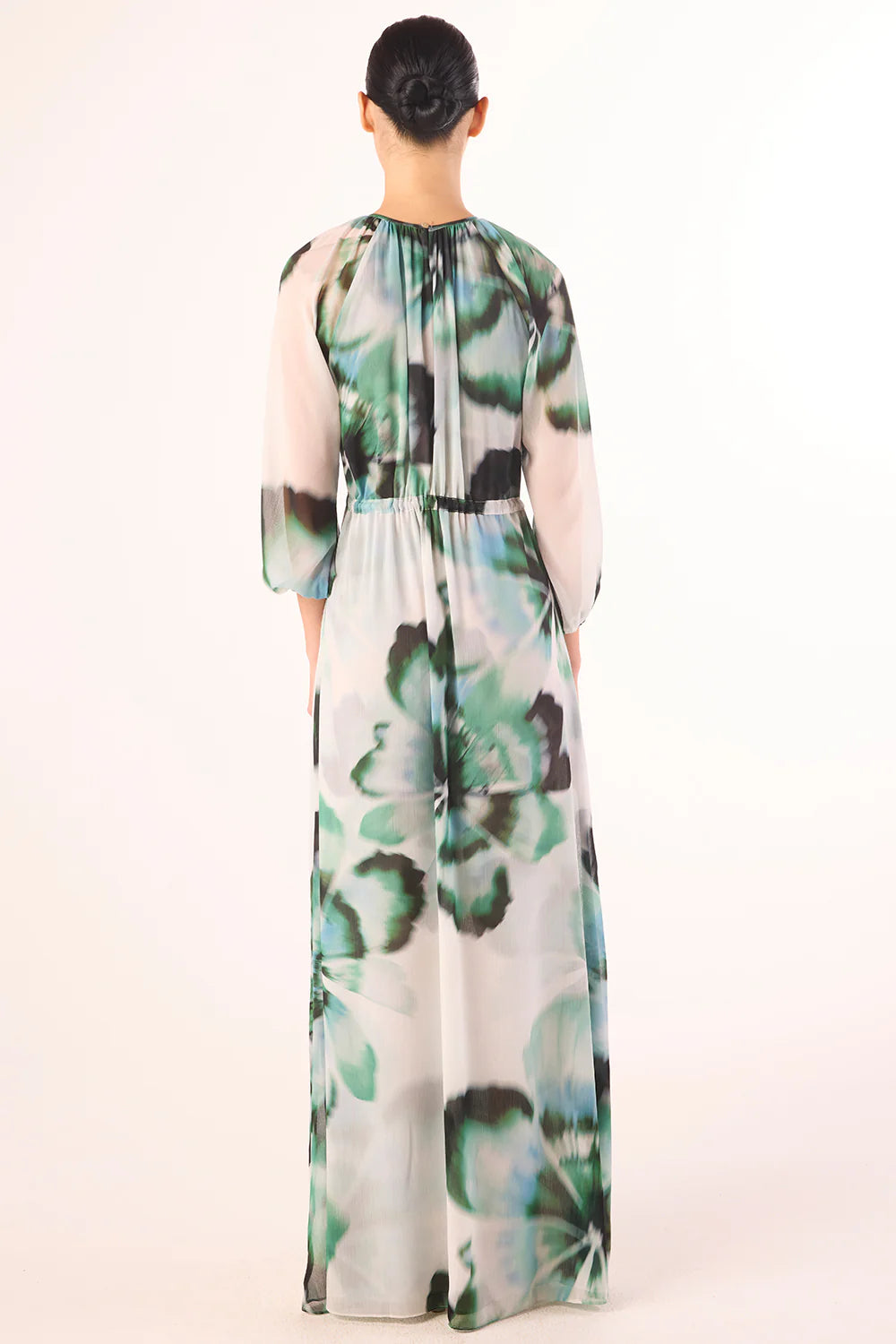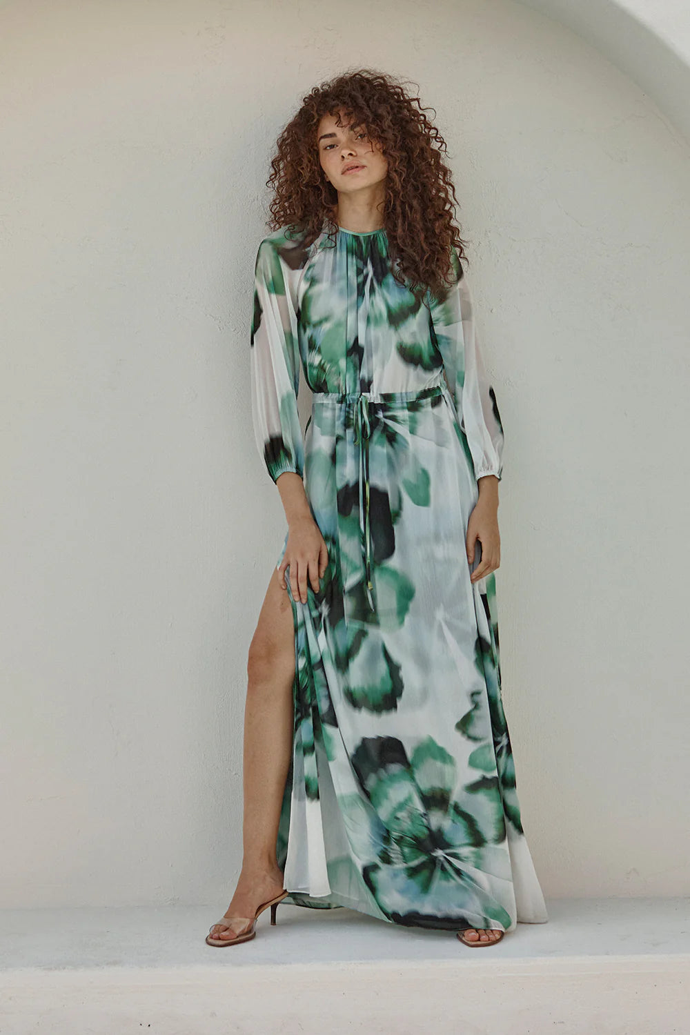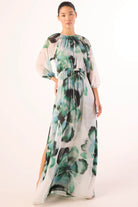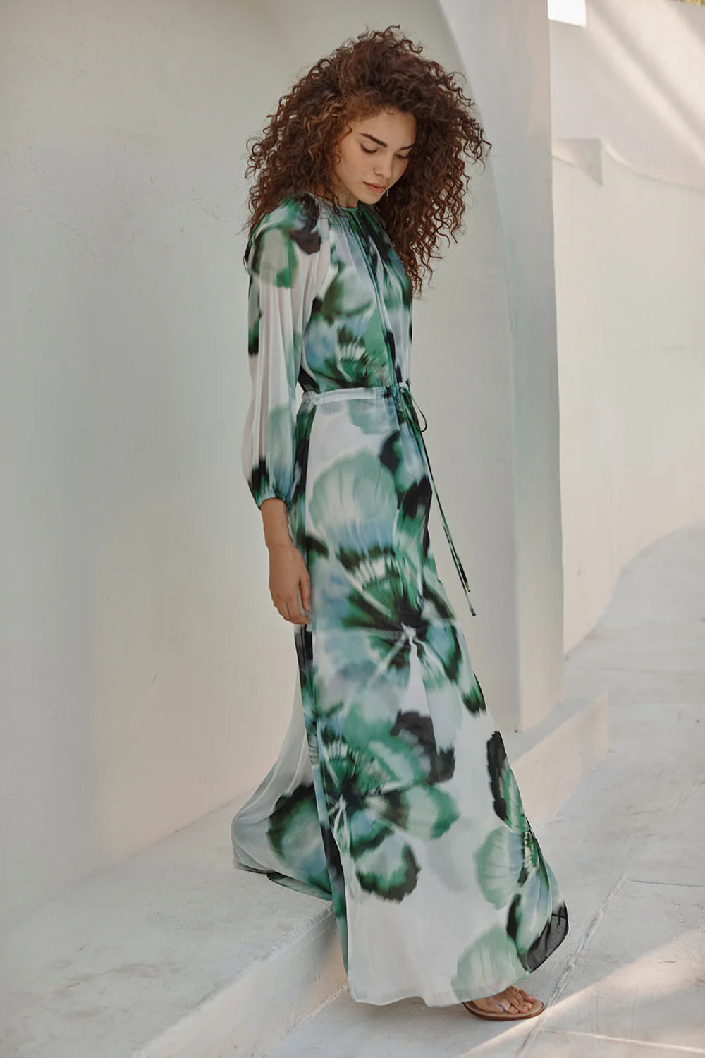 Elevate your special occasion wardrobe with the Perdita, an elegant maxi dress from Misa. Crafted from luxurious verdant anemone printed chiffon, this trans-seasonal piece features a sophisticated high neckline and back keyhole button closure for refined detail. Long billowing sleeves and a sweeping skirt with side slit create graceful movement, while the adjustable tie waist ensures a flattering silhouette for every body type. Fully double lined for comfort and durability, the Perdita transitions seamlessly from weddings to evening events and beyond.