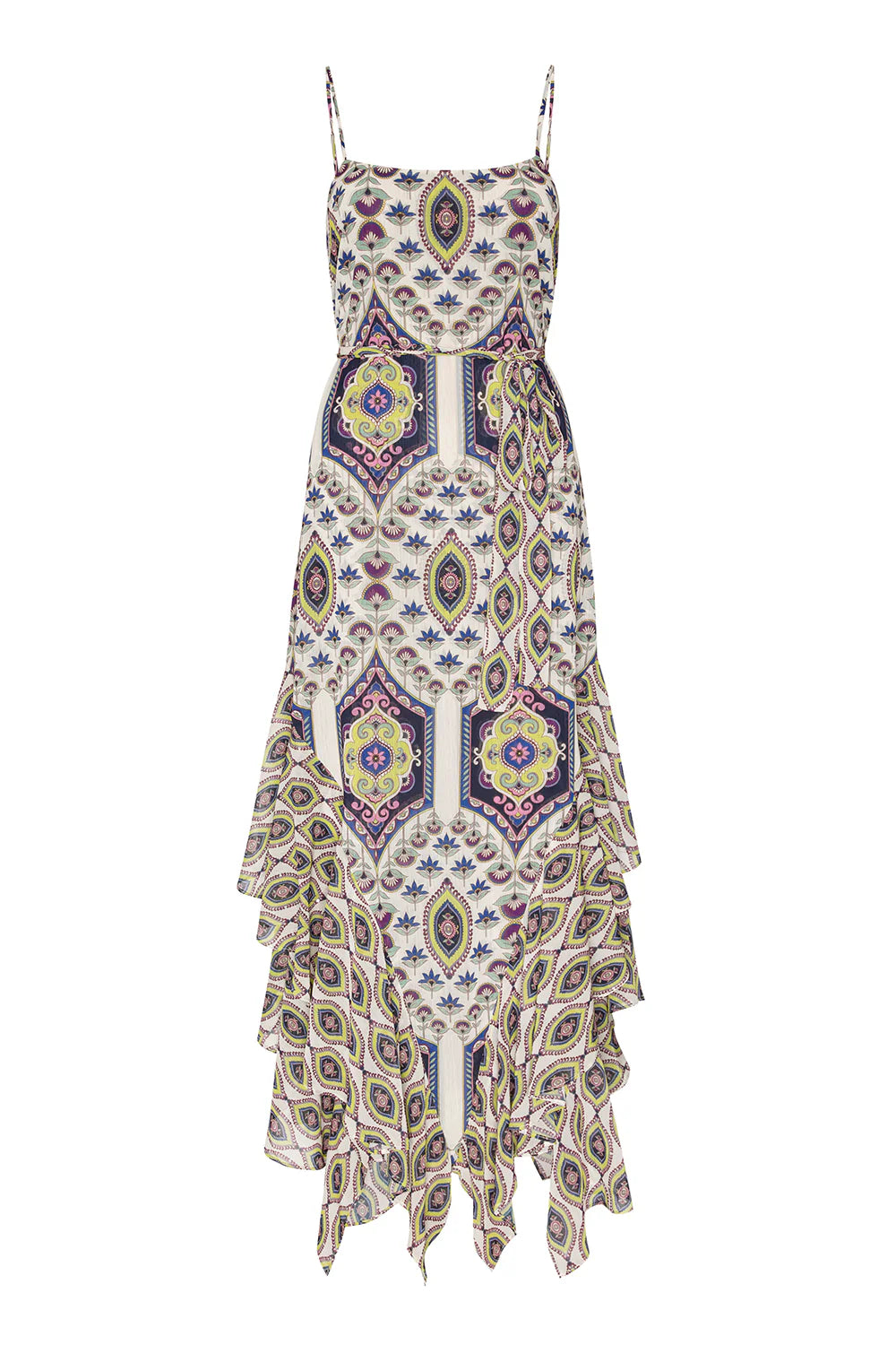 The Veronica midi dress showcases an enchanting mosaic eye–printed chiffon with a refined silhouette. Featuring a classic straight neckline and delicate adjustable spaghetti straps, the design features a striking visual progression—the print scales up dramatically from the bodice into a pointed V that extends to the hem. A tiered handkerchief ruffle hem adds movement and texture, rendered in a smaller-scale version of the mosaic eye motif for sophisticated layering. Complete with an optional self-tie belt, this versatile piece transitions effortlessly from day to evening occasions.