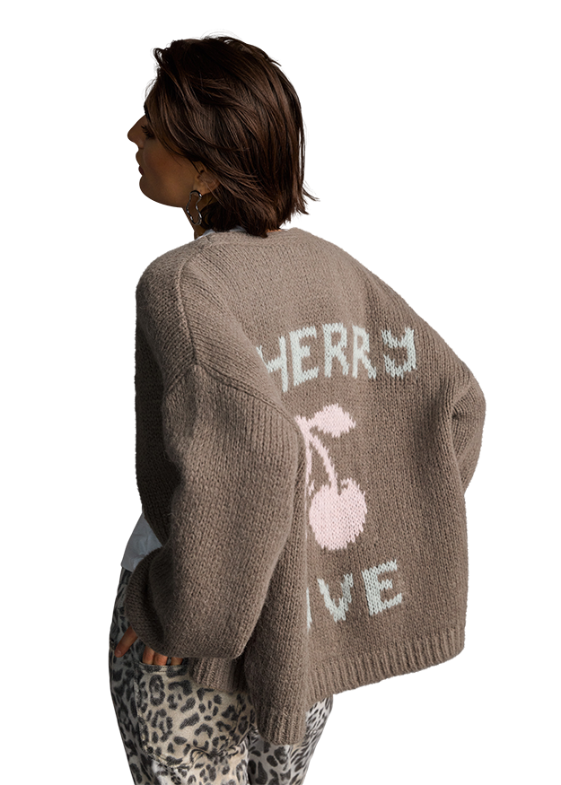 Creative design meets everyday practicality! Classic at first glance, but the cherry pattern on the back makes this RIANI cardigan a highlight. The playful cherry and ‘Cherry Love’ lettering in delicate pastel colours give it a youthful, fresh touch. This high-quality it-piece combines simple elegance with a touch of sweetness - just like a cherry - and will sweeten your outfit!