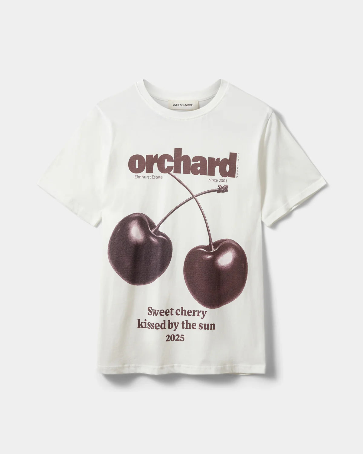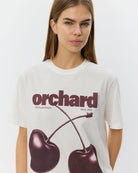 Sofie Schnoor Women's T-Shirt features a relaxed fit with short sleeves and a classic round neckline. The front showcases a striking cherry print accompanied by "Orchard" and "Sweet cherry kissed by the sun 2025" text. Perfect for casual everyday wear, this tee combines comfort with artistic flair and makes a charming style statement.