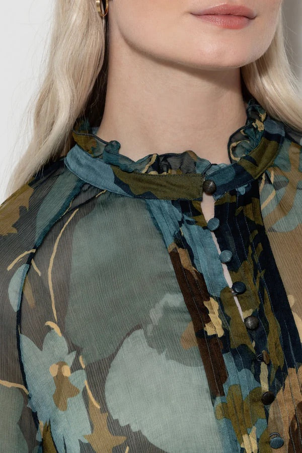 Blouse made from ultra-thin, transparent silk cork crepe with an abstract floral design. The front is decorated with a pintuck drape with a button placket and the fabric falls in light pleats around the ruffled collar.