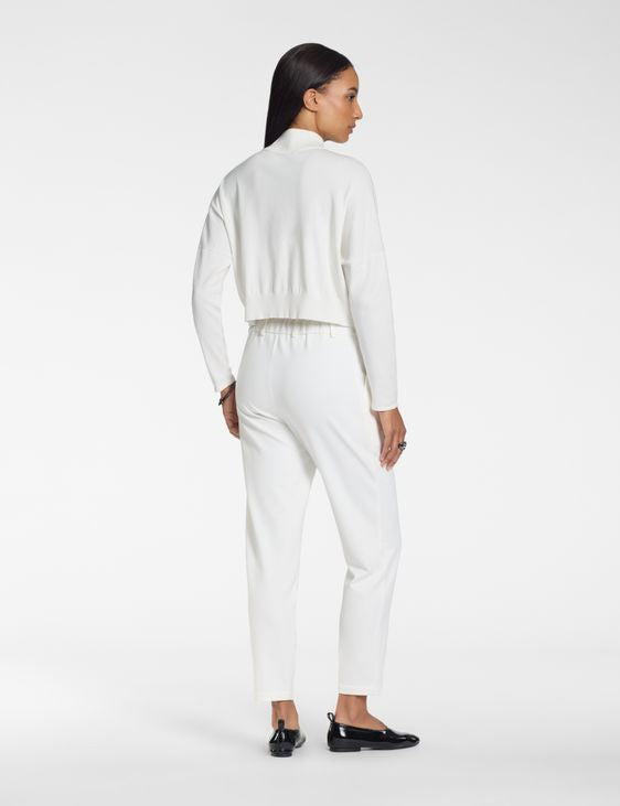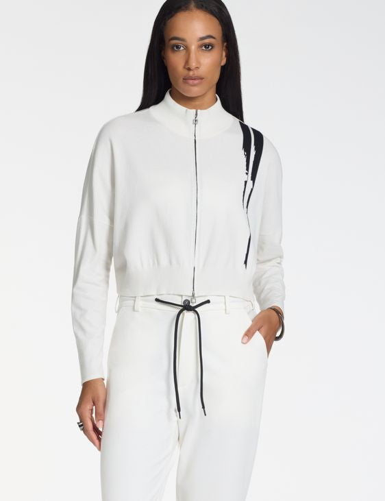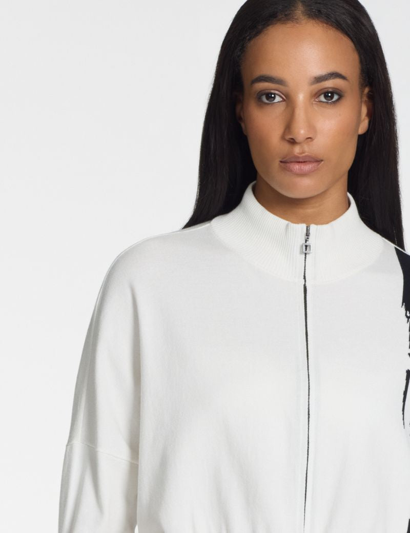 A sporty zip-up silhouette with a high collar, this cardigan is made from a viscose-polyester blend designed for comfort. Two-tone intarsia adds a graphic nod to traditional weaving techniques—a clean fusion of structure and style.