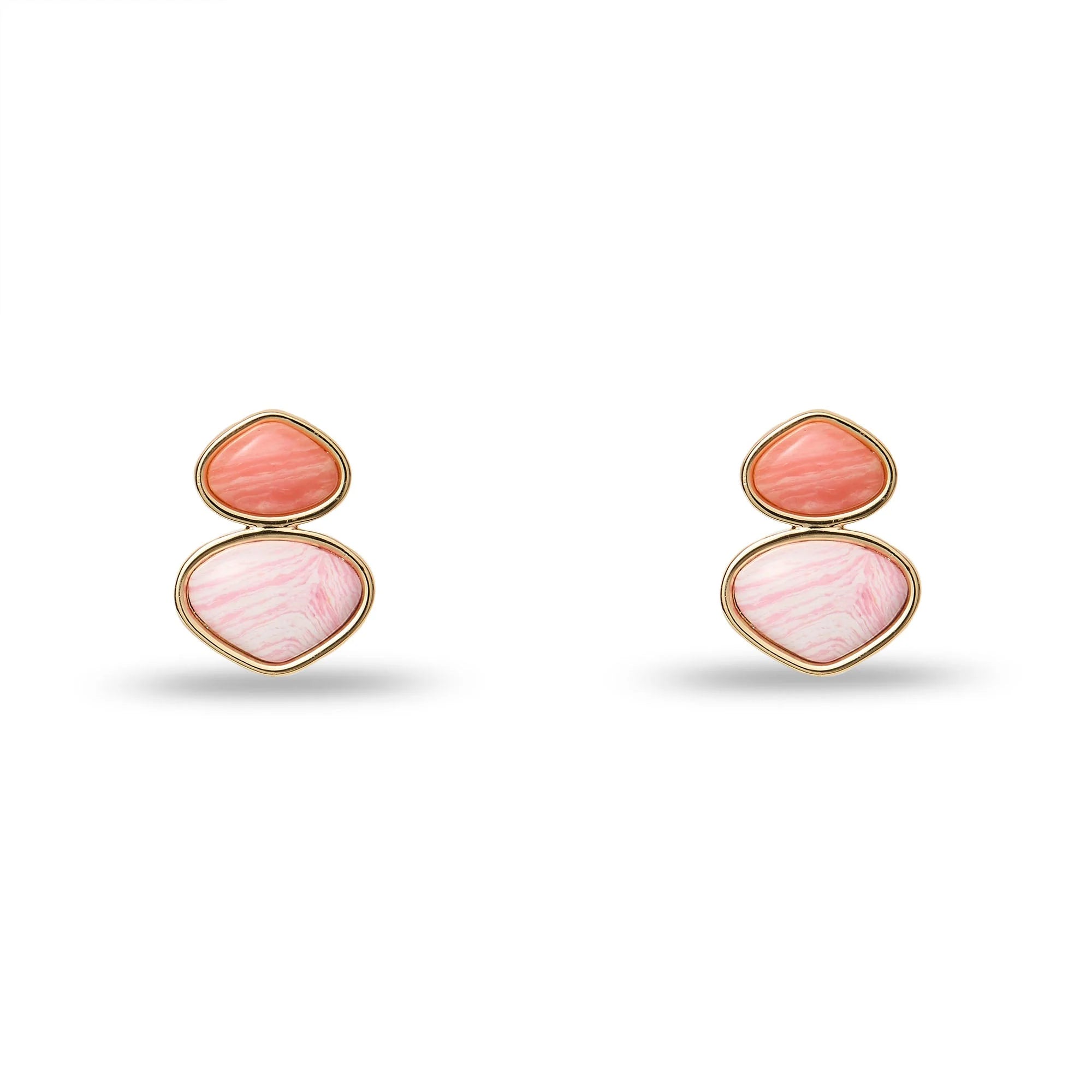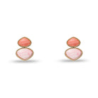 Delicate two-stone drop earrings featuring a triangular pink calcite stone suspended beneath a smaller flamingo pink rhodochrosite stone, both set in gleaming bezels. Crafted with 14K gold-plated hardware and secured with surgical steel omega posts for comfort and durability. Dimensions: 1" by 3/4". A sophisticated addition to any jewellery collection.